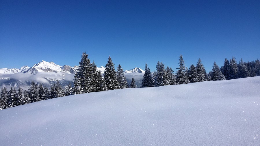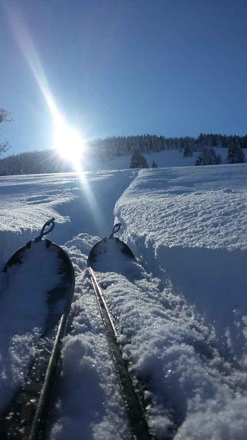 Die Premiere des Theaterstücks naht mit Siebenmeilenstiefeln- wieso also nicht die Zeit mit Skistiefeln und Mohair sinnvoll überbrücken, jetzt, wo der Schneeteppich bis ins Tal gelegt ist? Optimale Bedingungen und Ruhe total auf dem Vilterserälpli hinauf zum "Schwiifiggler". Nur der "WEF-Verkehr" dieser Tage dringt immer wieder in diese Idylle - um klar zu machen, dass es noch wichtigere Dinge auf dieser Welt gibt? Manchmal ist es für die Seele besser, diesen Rummel etwas auszublenden. Ein letzter Abendgruss der untergehenden Sonne, die schon dem Mond am Himmel Platz macht. Was für ein Tag!