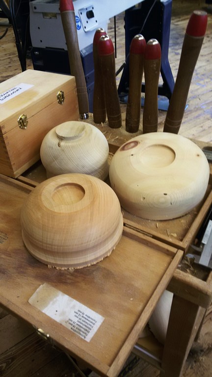 Beim Querholzdrechseln am dritten Tag war dann jedoch plötzlich der Wurm drinn – nicht nur im Arvenholzwerkstück! Mir knallte es innerhalb kurzer Zeit gleich dreimal ein Werkstück von der Drechselbank. Dies hatte zur Folge, dass ich plötzlich mehr am Rotieren war als die Drehspindel und völlig von der Rolle geriet. Meine Kopflastigkeit, die ohne Zweifel in manchen Situationen auch von Vorteil ist, kam mir wieder mal etwas in die Quere. Plötzlich nahm ich die horrende Geschwindigkeit des drehenden Holzstückes überdeutlich war und hatte entsprechend einen Heidenrespekt, um nicht zu sagen eine Höllenangst, dass es mir dieses Ungetüm oder gar das Messer um die Ohren haut. Glücklicherweise gelang es mir dann, diese Blockade zu lockern, Schritt für Schritt wieder Vertrauen zu fassen und einige Schalen fertigzustellen. Den Holzwurm im Arvenholz habe ich so auch erfolgreich weggedrechselt.