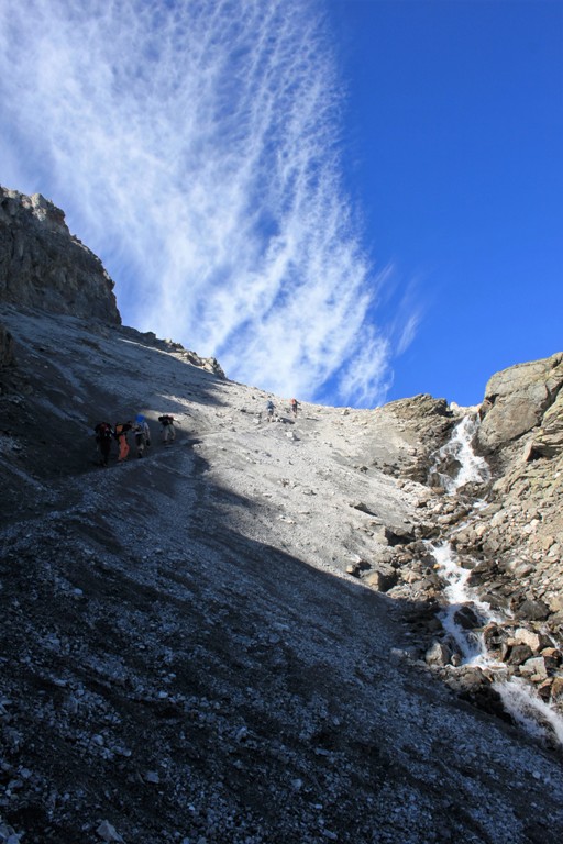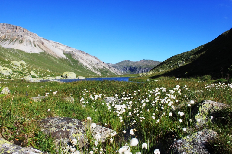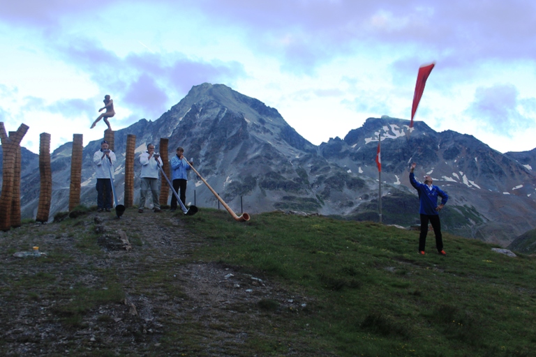Szenen- und Landschaftswechsel: Am 1. August tappen wir im Nebel vom Julierpass auf die Fuorcla d’Agnel und tasten uns über Geröll mit klammen Händen hinunter zum Lai d’Agnel. In diesem Gelände bewähren sich einmal mehr die Wanderstöcke. Zum Glück drückt das mitgebrachte Alphorn nicht allzu fest. In der Jenatschhütte geniessen wir einen friedlichen und vor allem knall- und gestankfreien 1.August-Abend untermalt mit Alphornklängen, umrahmt mit Fahnenschwingen und umgeben von einer wunderbaren Bergkulisse.