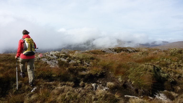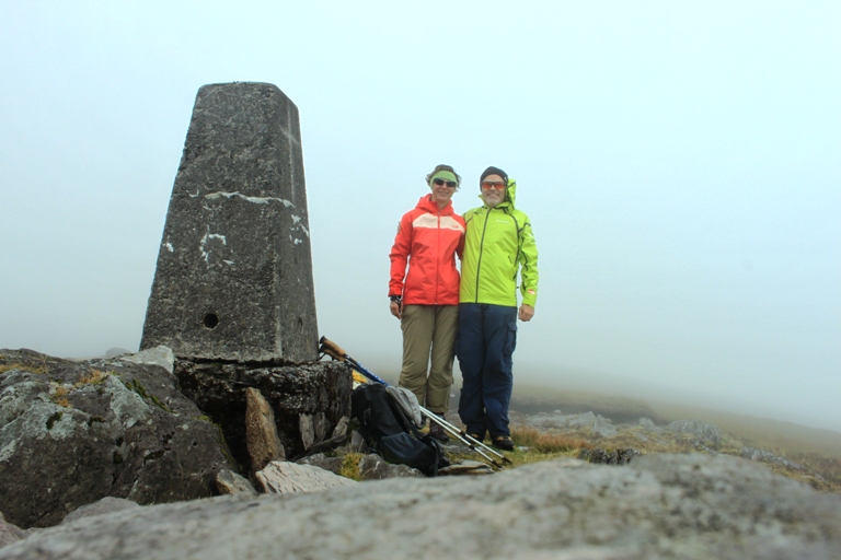 Ein kleines Seelein, Schafe, grüne Weiden und gelbe Büsche – nur noch schnell ein Foto von dem Hügel dort! Beim Zurückhüpfen auf den Weg passiert’s: den rechten Fuss übertreten und knacks! Nein, nein nicht schlimm, geht schon – ich will jetzt auf diesen verdammten Hungry Hill. Für Schweizer peanuts meinte André. Der Weg verliert sich bald in den Büschen und im Sumpf. Macht nichts, der Gipfel ist immer oben. Auf dem weiteren Weg scheisse ich mir erst noch ein gewaltiges Pfund Frust aus dem Hintern. Erleichtert geht’s dann dem erweiterten Gipfelplateau entgegen. Barbara’s Sorgenfalten werden beinahe so tief wie die Furchen im Berg. Ich lasse mir meine Sorgen nicht anmerken. Panik auf dem Berg ist ein schlechter Ratgeber. Die Nebelfetzen auf dem Gipfel verdichten sich zu einer grauen Milchsuppe. Banane und Riegel schnell hinuntergeschlungen, Gipfelfoto und nichts wie weg von hier, so lange noch eine Spur von Sicht besteht. Es sieht alles gleich aus und von Weg keine Spur! Zum Glück hat Manitou heute für einmal ein Nachsehen mit uns und bläst die Nebelschwaden weg. So huschen wir über Felshürden und Moorpfützen wieder dem Tal entgegen, nicht ganz auf der Aufstiegsroute zwar, aber Hauptsache unten… huch.