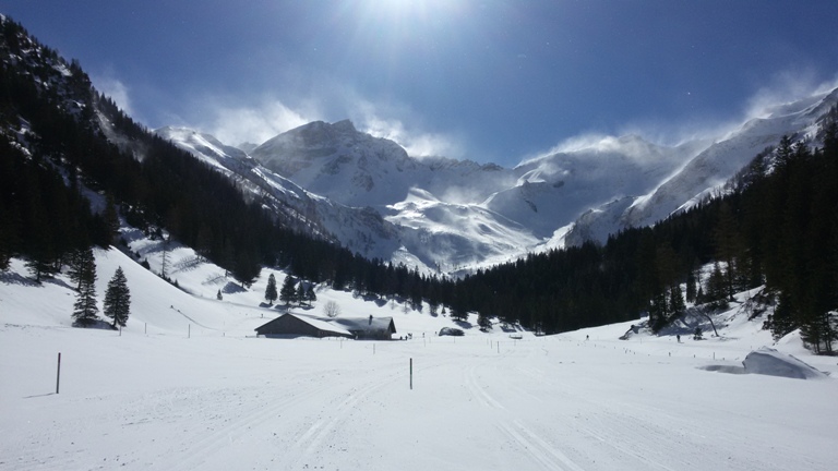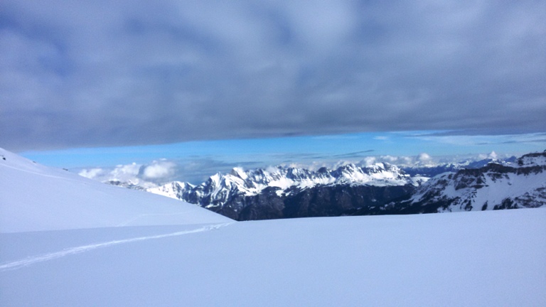 Szenenwechsel: Skitour zum Wissmeilen. Für die Abfahrt vom Gipfelhang haben mein Bruder und ich noch gute Sicht. Wir entschliessen uns, nochmals aufzusteigen und über den Grat richtung Magerrain zu einem ideal geneigten Pulverschneehang zu gelangen. Die letzten Meter zum Grat sind ausgeblasen, eisig und besser mit geschulterten Skis zu bewältigen. Hoppla, unverhofft finde ich mich eine Etage tiefer mit freibaumelnden Beinen über einer dunklen Felsspalte. Zum Glück bin ich mit meinen Oberarmen an den Seitenwänden hängen geblieben. Schneeabklopfen – nichts passiert. Den Genuss der Pulverschneeabfahrt schmälert dann der mitlerweile aufgezogene Nebel.