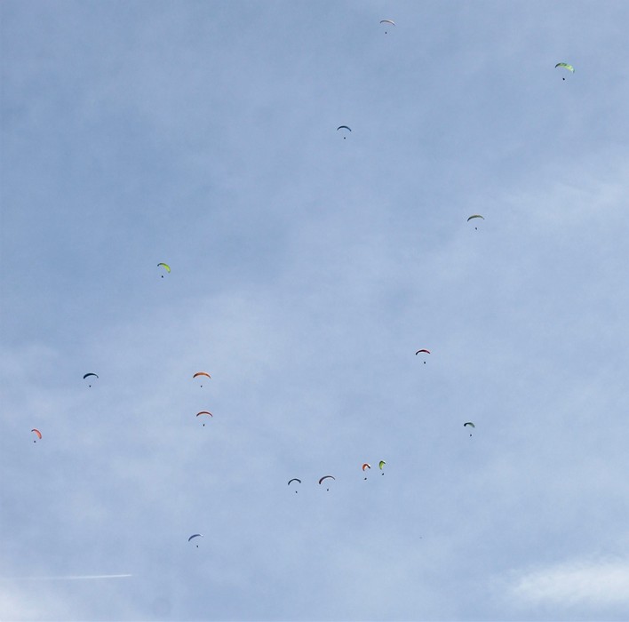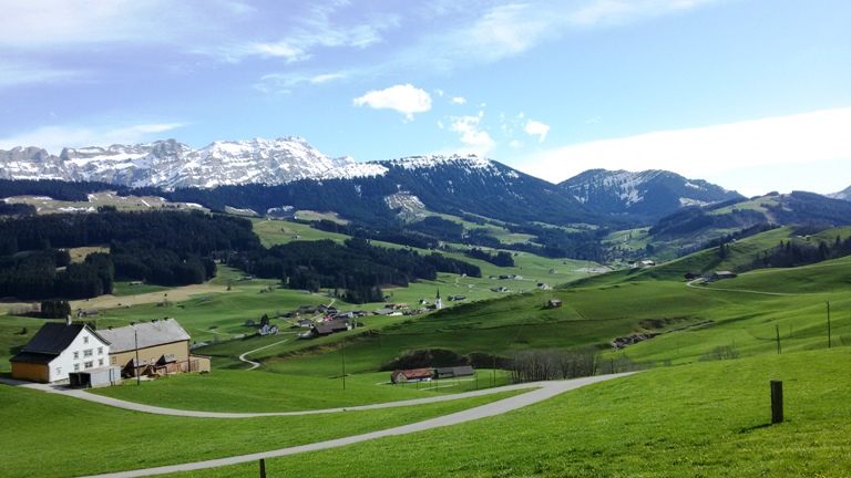 Auf Mountainbike-Tour im Appenzellerland wundern wir uns, warum uns nicht mehr Biker begegnen in diesem wunderschönen, hügeligen Gebiet – eigentlich prädestiniert zum Bergveloerlebnis. Ahaa disziplinenüberschreitender Dichtestress. Appenzellerland ist eben Wanderland bekommen wir mit vorwurfsvollen Blicken zu spüren. Und wenigstens macht der Himmel wieder blau, heute jedoch mit dicht an dicht fliegenden Gleitschirmen.