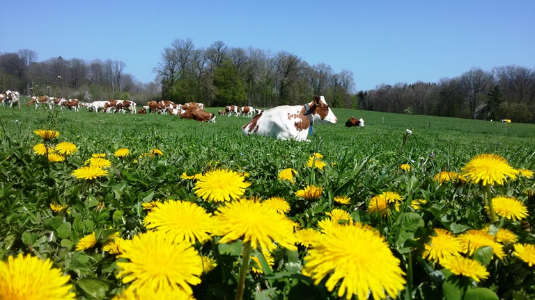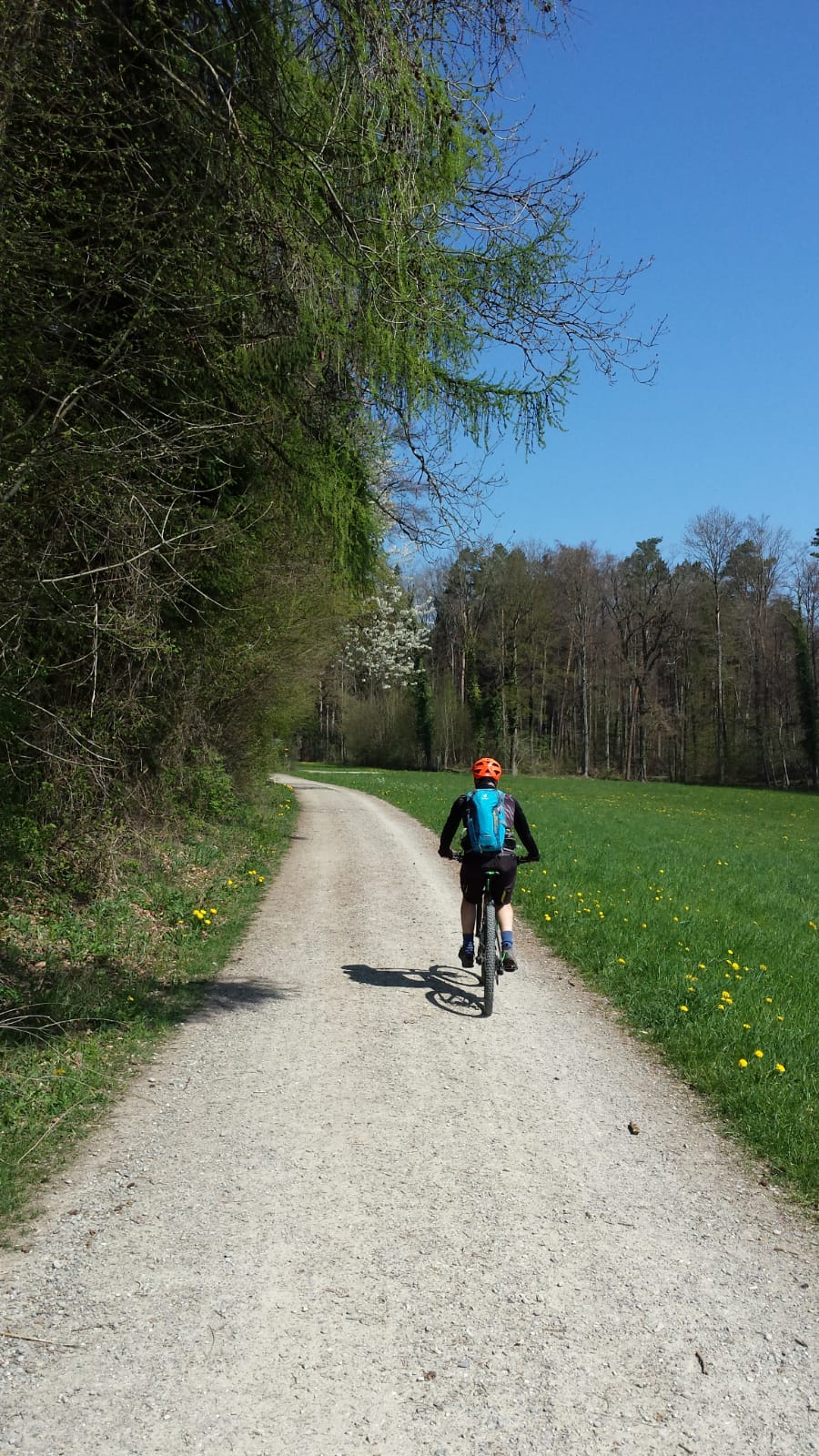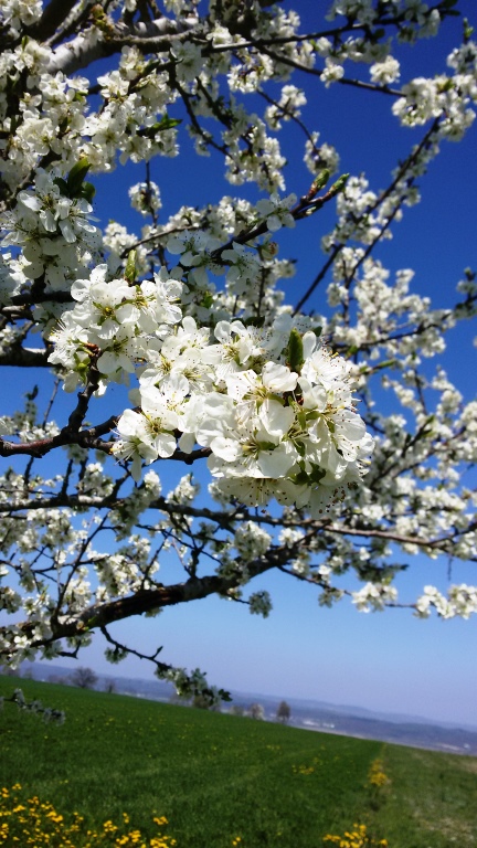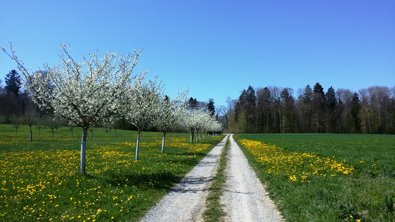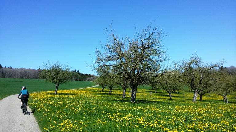 Schnell sind die Bikes startklar, und bei angenehmen Temperaturen finden wir uns kurze Zeit später auf wunderbaren „Schwiibluämäteppich“ zwischen kleinen Weilern und Hochstammgärten. Für die Apfelbaumblühte sind wir leider gut eine Woche zu früh, aber der eine oder andere Birnbaum und die Kirschbäume bilden schöne Kontraste zum saftig grün spriessenden Gras. Die Rapsfelder machen erst mit dem ihnen eigenen Duft auf sich aufmerksam. Die leuchtend gelben Blütenblätter lugen erst schüch hervor. Von so viel Blütenstaub läuft die Nase. Wir aber fahren mit unseren Bikes munter über Stock und Stein und bestäuben uns mit Seerückenpuderdreck.